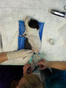Met behulp van gasnarcose wordt een chinchilla in slaap gebracht. De operatie zelf gebeurt net zoals bij een kater. Na de narcose zijn ze snel weer wakker en op de been.