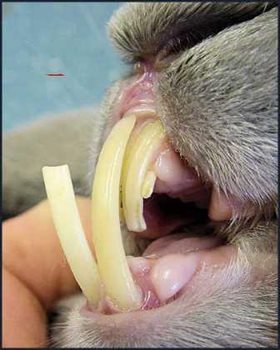 Tanden en kiezen van konijnen en knaagdieren groeien hun hele leven door. Regelmatig komt het voor dat de snijtanden te lang worden door scheefstand van de snijtanden. De scheefstand kan erfelijk zijn, maar ook komen door onvolledige voeding. Te lange snijtanden kun je laten inkorten door een boortje te gebruiken (nooit knippen!) of ze kunnen permanent verwijderd worden door ze te laten trekken.